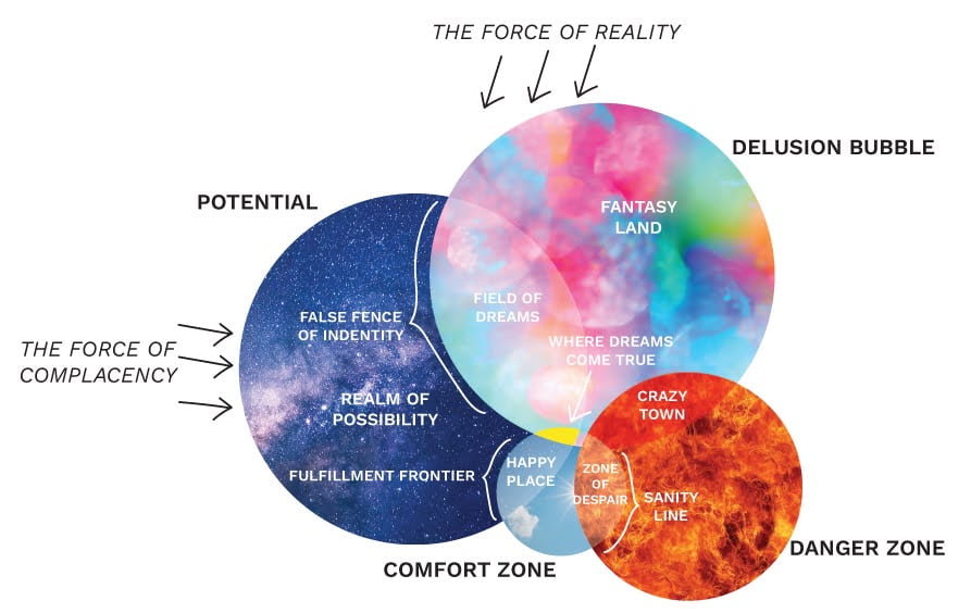 You may have heard about the comfort zone – and how “Where the magic happens” is OUTSIDE your comfort zone. Other authors have since moved on from there to talk about Growth or Expansion Zones. My favourite explanation (and where I got the colourful picture below right from) is by The Unconventional Route.